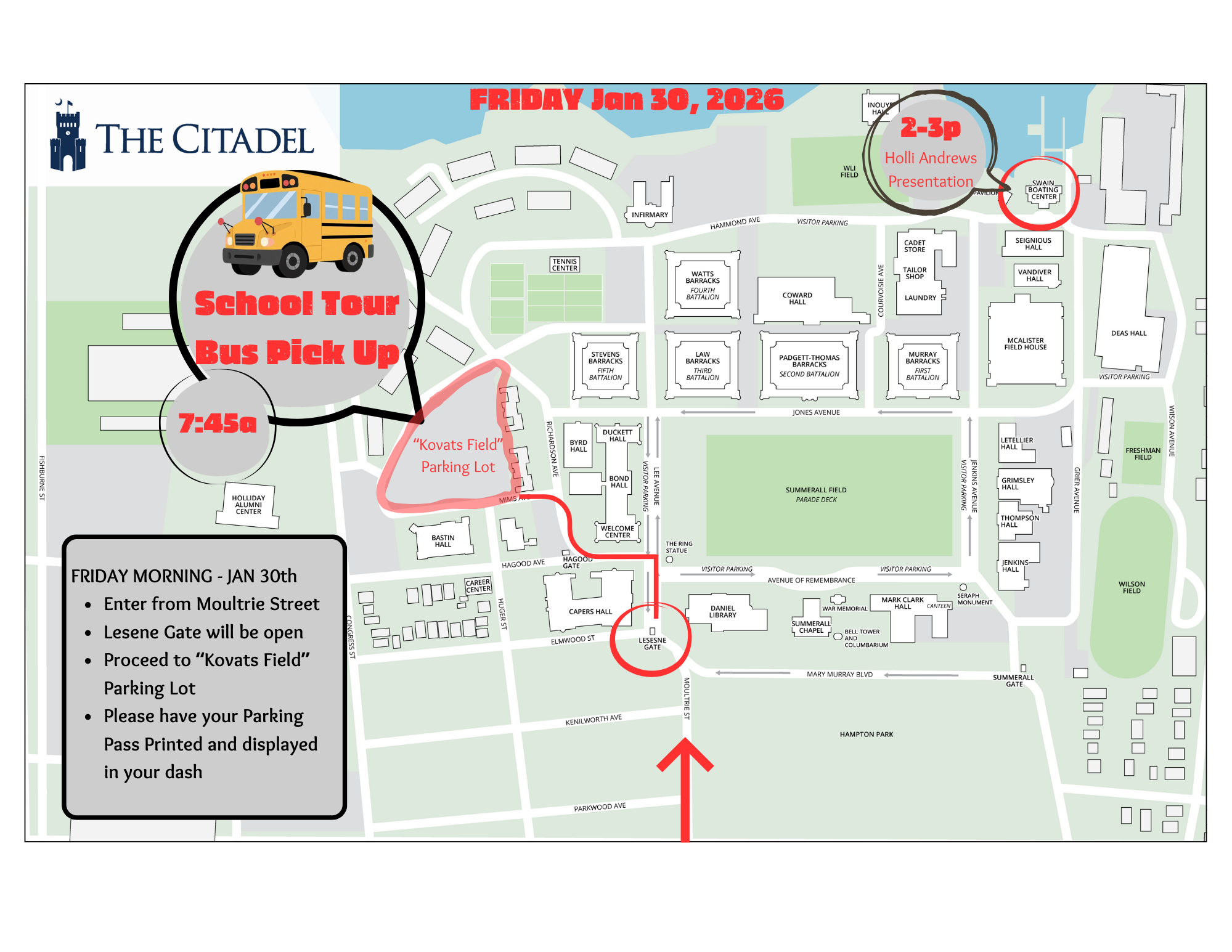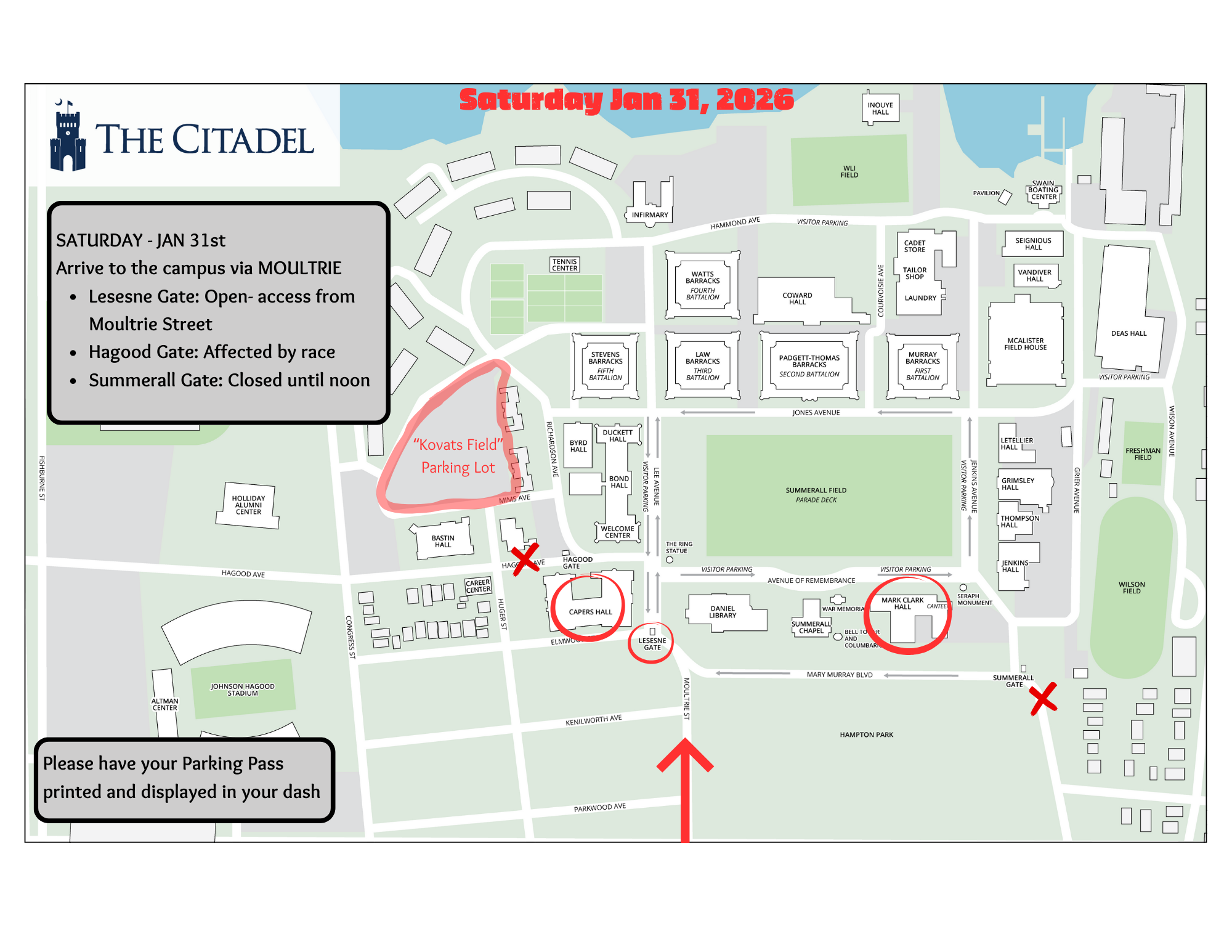Saturday morning has a half-marathon (weather permitting!) in Charleston with the routes coming near to the Citadel campus until 12pm. Streets where the race is passing through will have rolling closures to allow runners to pass, then let cars proceed again. (If you're interested in seeing detailed race routes: Charleston Half Marathon Routes) To avoid this arrive from Moultrie via Lesesne Gate.