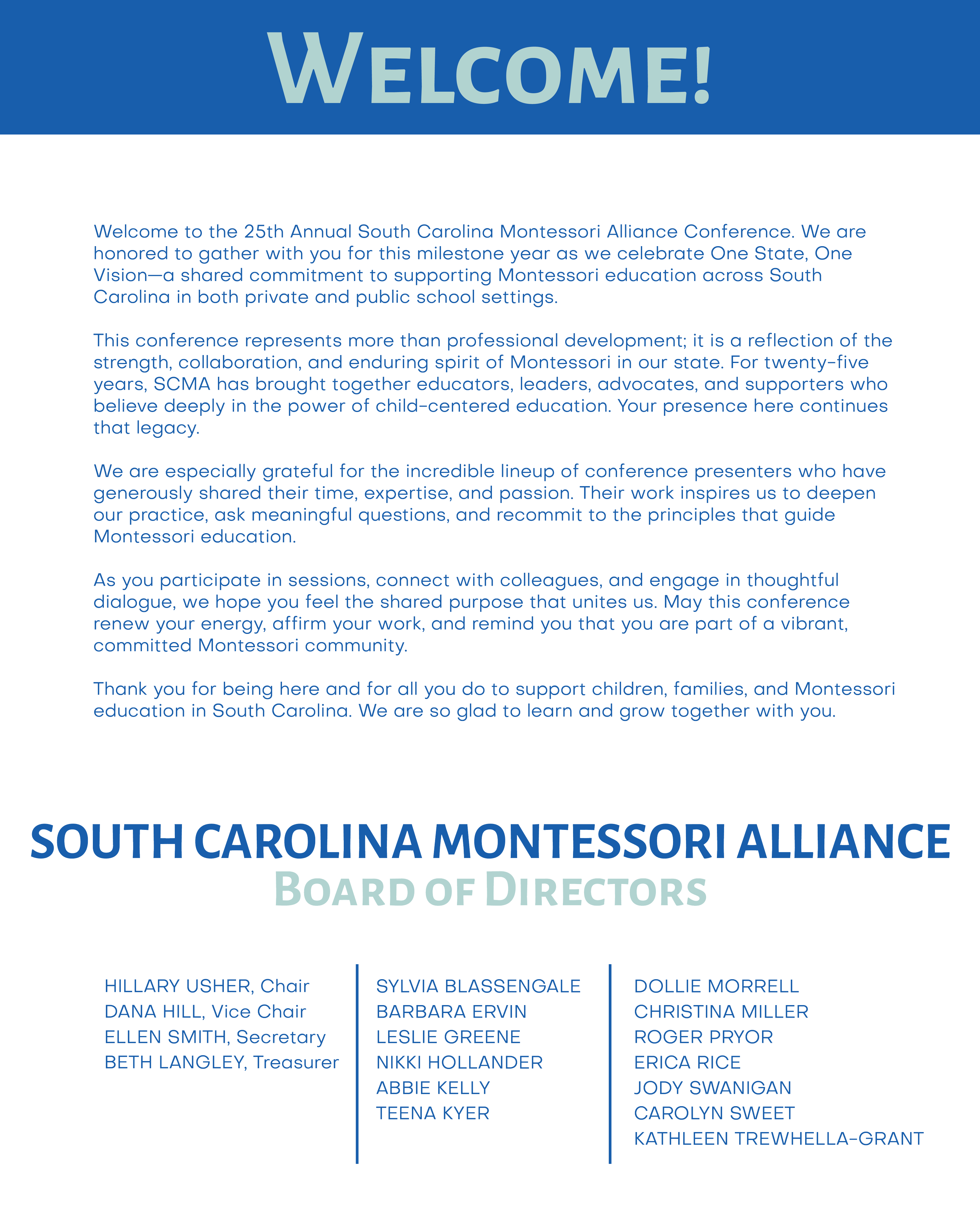 It is with heavy hearts that the South Carolina Montessori Alliance (SCMA) Board of Directors announces the cancellation of our Annual Conference, originally scheduled for this weekend, January 30 and 31, 2026.
